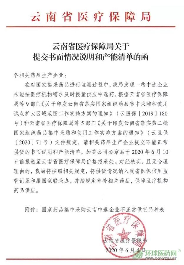 6月4日,云南省醫(yī)療保障局下發(fā)《云南省醫(yī)療保障局關于提交書面情況說明和產(chǎn)能清單的函》,該文件表示,在對國家?guī)Я坎少徦幤愤M行監(jiān)測的過程中,發(fā)現(xiàn)有一些中選企業(yè)未能按照醫(yī)院需求及時按量供應中選藥品,據(jù)此,云南省醫(yī)保局要求相關藥品生產(chǎn)企業(yè)提交不能正常供貨的書面說明和產(chǎn)能清單,加蓋公司公章后于6月1日前報送至云南省醫(yī)療保障局價格招采處。