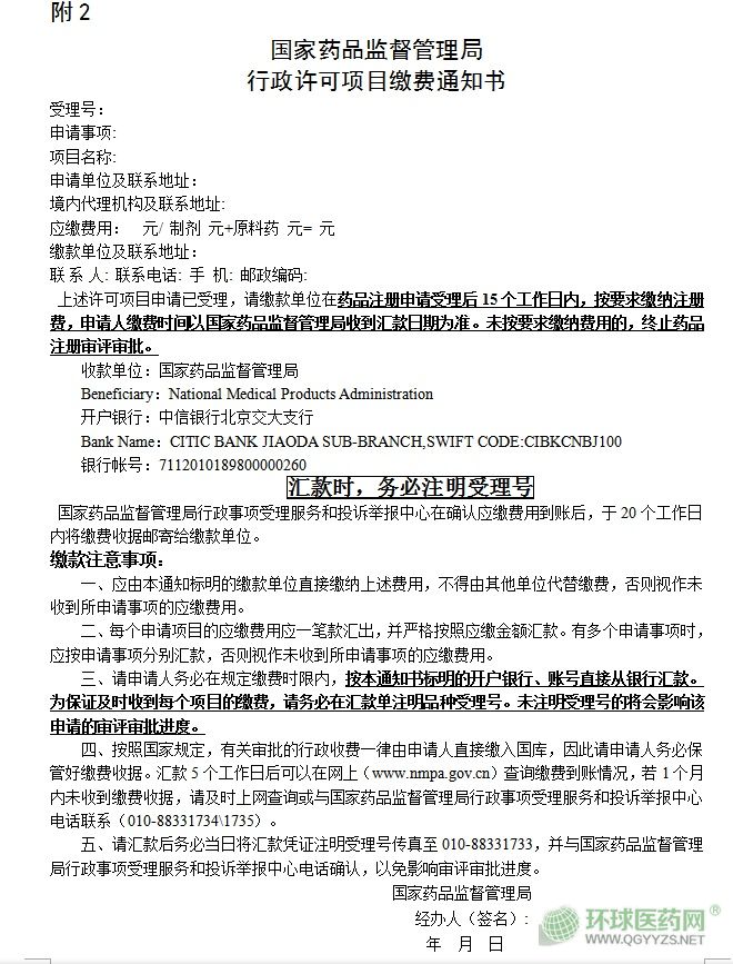 (四)藥品注冊申請受理后15個(gè)工作日內(nèi)按照要求繳納注冊費(fèi),申請人繳費(fèi)時(shí)間以國家藥品監(jiān)督管理局收到匯款日期為準(zhǔn)。未按要求繳納的,終止藥品注冊審評審批。