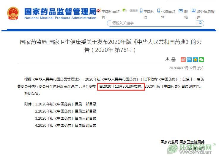 剛剛,國(guó)家藥監(jiān)局、國(guó)家衛(wèi)生健康委聯(lián)合發(fā)布關(guān)于發(fā)布2020年版《中華人民共和國(guó)藥典》的公告(2020年 第78號(hào))。正式頒布2020年版《中華人民共和國(guó)藥典》(以下簡(jiǎn)稱《中國(guó)藥典》)。2020年版《中國(guó)藥典》將于今年12月30日起正式實(shí)施。