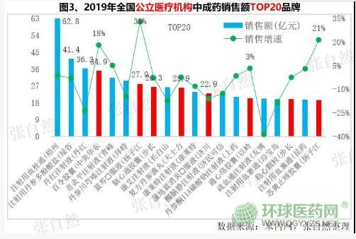 2019年全國公立醫(yī)療機構(gòu)(城市公立醫(yī)院、縣級公立醫(yī)院、城市社區(qū)中心(站)和鄉(xiāng)鎮(zhèn)衛(wèi)生院)銷售額最大的中成藥是注射用血栓通,達(dá)62.8億元,在銷售額TOP20中,增速最快的是揚子江的藍(lán)芩?服液,增速高達(dá)33%。近年來,隨著對輔助用藥的限制和合理用藥的加強,中藥注射劑受到了很大影響,銷售額TOP20品種中,中藥注射劑數(shù)量逐漸減少,口服中成藥數(shù)量逐漸增多,2019年TOP20中已有8個口服中成藥入圍(圖3中紅色柱),而此前TOP20則只有幾個口服品種,其他絕大多數(shù)是中藥注射劑。