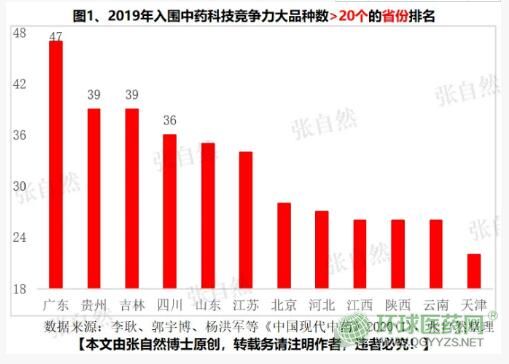 入圍2019年中藥大品種科技競爭力排行榜產(chǎn)品最多的省份是廣東,共有47個品種入圍,其中廣州白云山旗下企業(yè)就占了16個,分別是消渴丸、小兒七星茶顆粒、廣東涼茶顆粒、華佗再造丸等知名品牌;位居其后的是貴州和吉林,各有39個品種入圍,貴州入圍品種數(shù)最多的企業(yè)是貴州益佰,有7個(克咳膠囊、金骨蓮膠囊、復(fù)方斑蝥膠囊等),吉林入圍最多的企業(yè)是通化金馬,有3個(壯骨伸筋膠囊、治糜康栓、風(fēng)濕祛痛膠囊)入圍。入圍大品種數(shù)最多的前8個省份(廣東、貴州、吉林、四川、山東、江蘇、北京、河北)占了全國的一半,共有285個品種入圍。