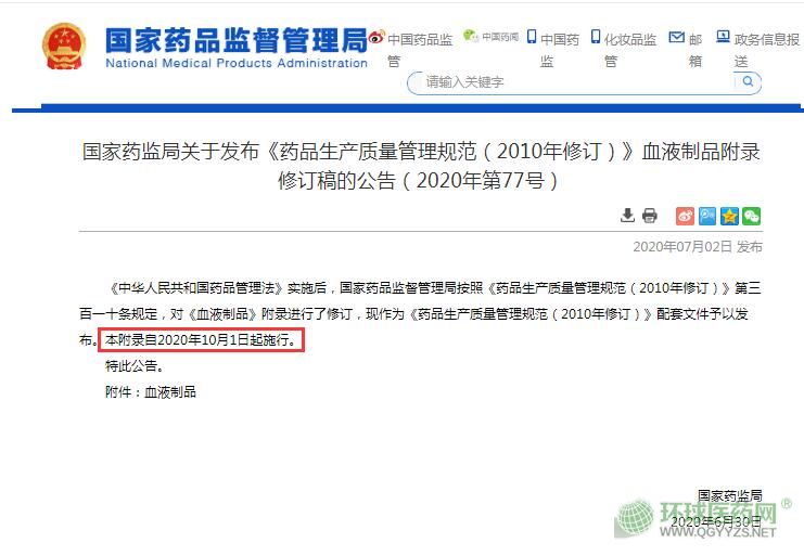 7月2日,國(guó)家藥品監(jiān)督管理局發(fā)布《藥品生產(chǎn)質(zhì)量管理規(guī)范(2010年修訂)》血液制品附錄修訂稿的公告(2020年第77號(hào)),附錄自2020年10月1日起施行。