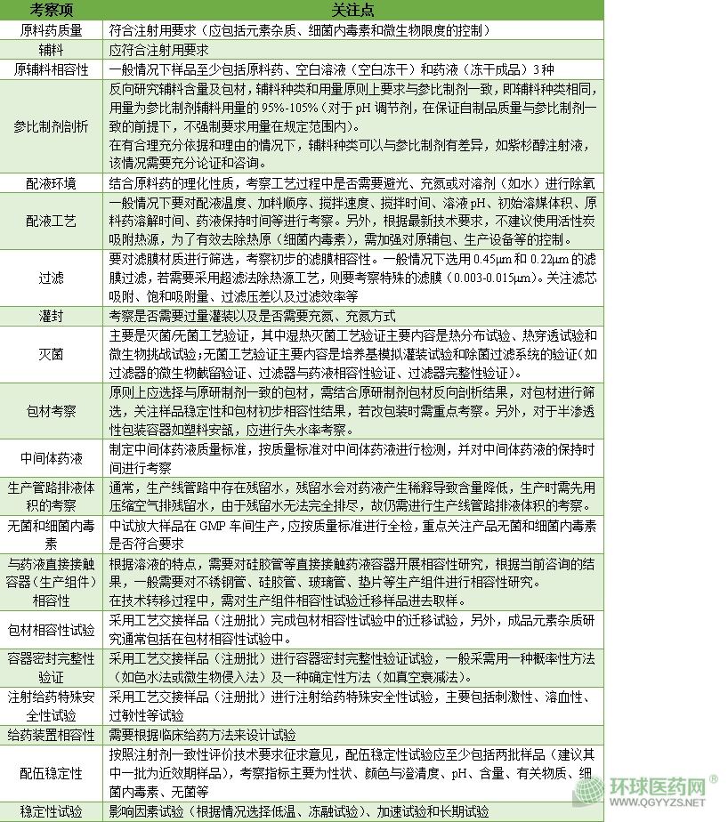對(duì)于普通注射劑的仿制,不同于口服固體制劑,無(wú)需進(jìn)行體外溶出擬合,但對(duì)于質(zhì)量要求更為嚴(yán)格。需以輔料組成(Q1)相同,用量(Q2)相同(仿制藥輔料用量為參比制劑相應(yīng)輔料用量的95%~105%)為前提,對(duì)原輔包的質(zhì)量、滅菌工藝、配伍穩(wěn)定性、安全性及相容性等進(jìn)行嚴(yán)格的考察。
