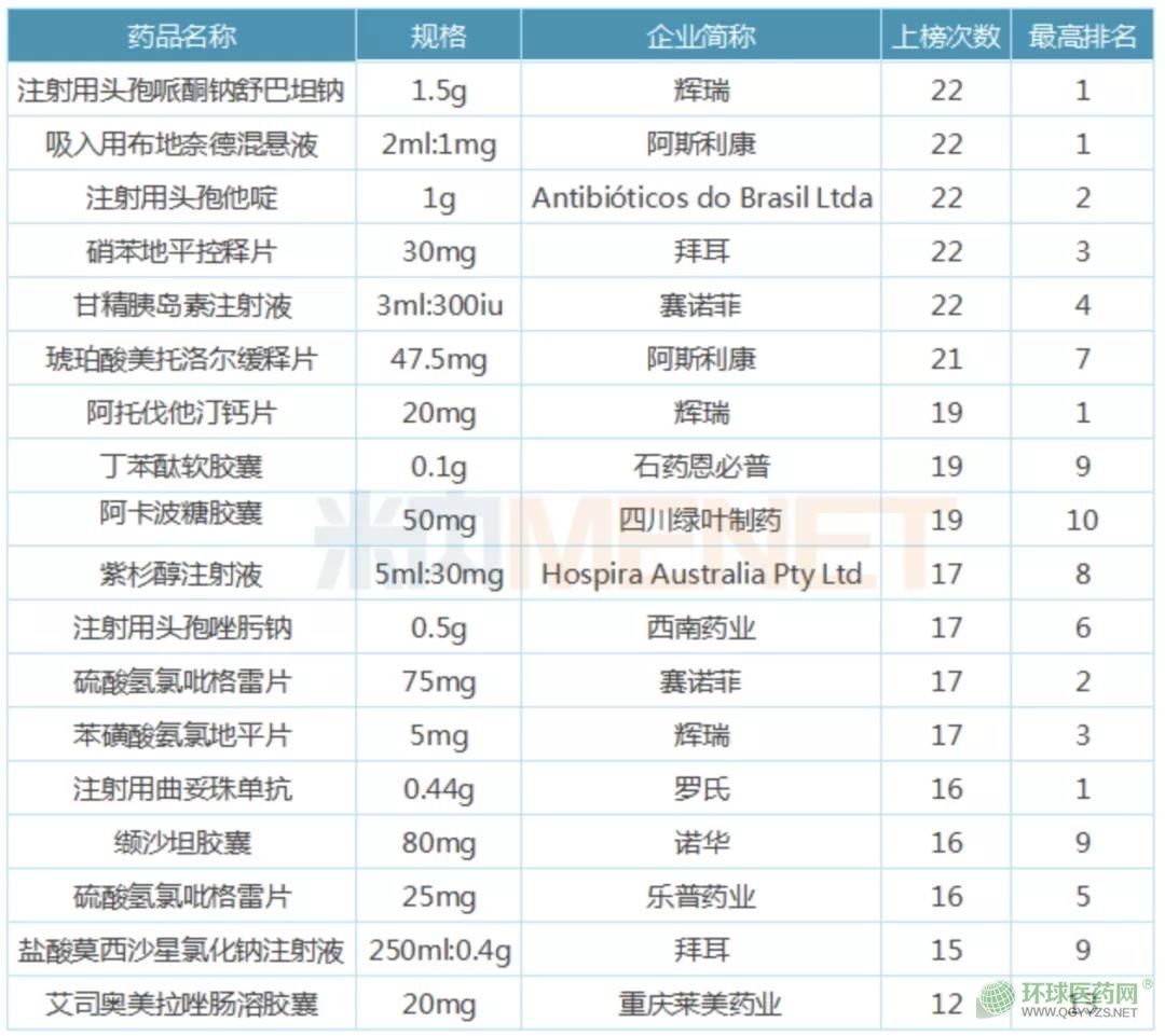 其中,輝瑞的阿托伐他汀、賽諾菲的硫酸氫氯吡格雷、輝瑞的苯磺酸氨氯地平和樂(lè)普的硫酸氫氯吡格雷片均榜上有名,且均上榜17次以上,最高排名基本都在前三名。