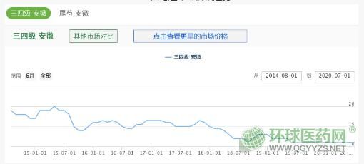 以白芍為例,根據(jù)中藥材天地網(wǎng)數(shù)據(jù)顯示,其在亳州市場2014年的價(jià)格在每公斤19元左右,目前其價(jià)格為每公斤11元左右。查看下圖我們可以發(fā)現(xiàn),近幾年來其價(jià)格雖然有震蕩和小范圍波動(dòng),但是其走勢(shì)圖的曲線是逐漸往下走的。這種情況,才能說這個(gè)品種的價(jià)格走低。