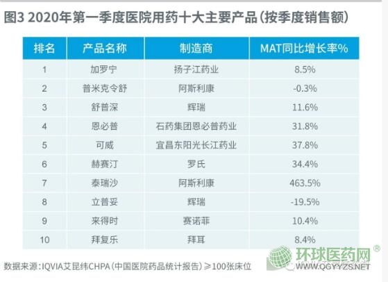 據(jù)IQVIA,受疫情影響,2020年第一季度,各品類的季度銷售額同比下降明顯,但抗腫瘤藥受疫情影響較小,這也直接體現(xiàn)到赫賽汀和泰瑞沙的排名上。
