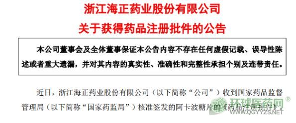 近日,浙江海正藥業(yè)股份有限公司收到國家藥品監(jiān)督管理局核準(zhǔn)簽發(fā)的阿卡波糖片的《藥品注冊(cè)批件》。
