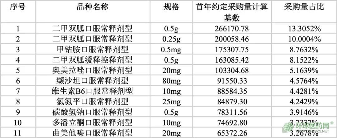 從品種名單和采購量來看情況,二甲雙胍、甲鈷胺、奧美拉唑、纈沙坦、維生素B6、氯氮平、碳酸氫鈉、多潘立酮、曲美他嗪等9個(gè)品種,合并劑型之后的約定采購量接近此次整體采購量的七成。其中最為突出的二甲雙胍,合并口服常釋劑型和緩釋控釋劑型更是占比超過30%。