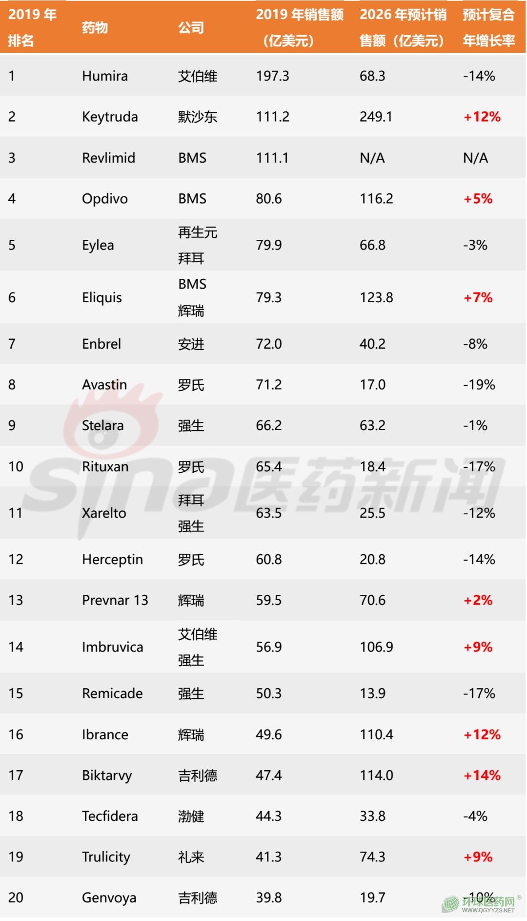 但是隨著某些藥物的專利到期,生物類似藥陸續(xù)推出搶占市場份額,到2026年,榜單上藥物將面臨不同的命運。