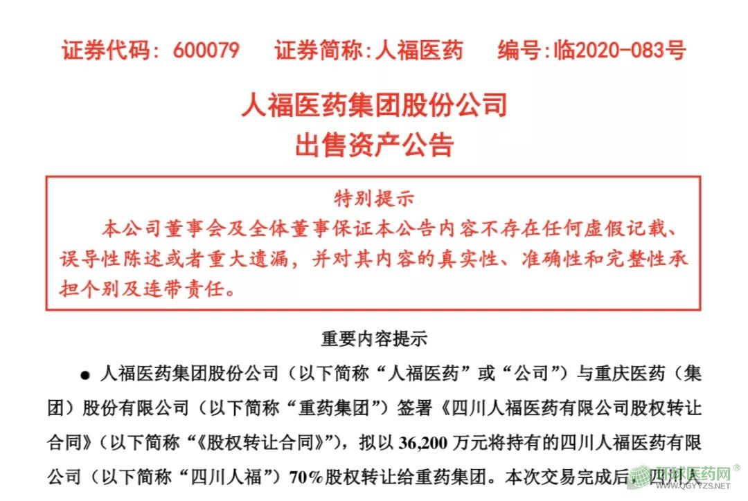 公告顯示,人福醫(yī)藥和重藥集團(tuán)于2020年8月5日(今日)簽署《股權(quán)轉(zhuǎn)讓合同》,擬以3.62億元將持有的四川人福 70%股權(quán)轉(zhuǎn)讓給重藥集團(tuán)。本次交易完成后,四川人福將不再納入公司合并報(bào)表范圍。