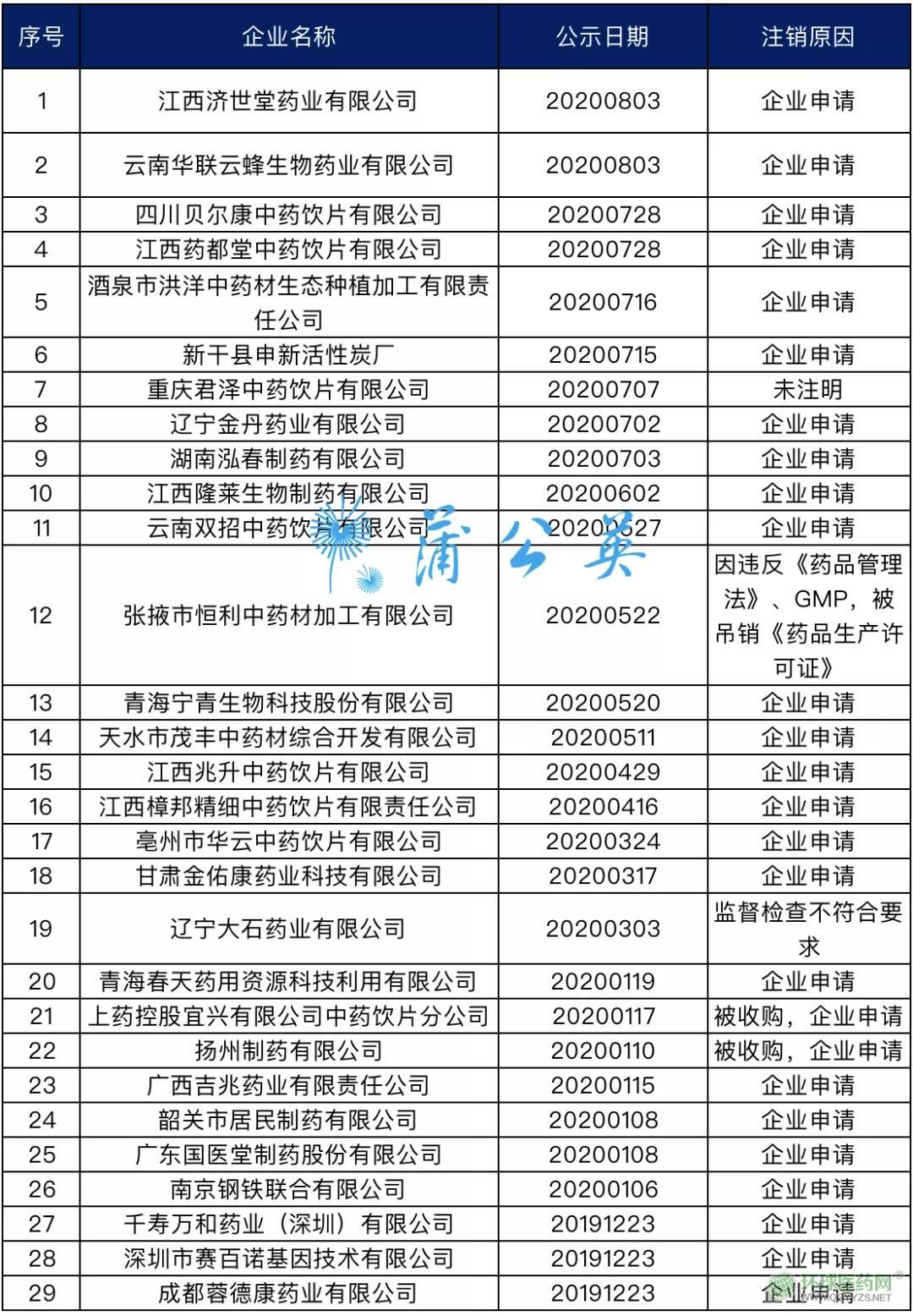其中2家藥企張掖市恒利中藥材加工有限公司、遼寧大石藥業(yè)有限公司是因監(jiān)管部門檢查不符合要求,而吊銷《藥品生產(chǎn)許可證》;其它27家藥企均為企業(yè)申請或被收購后注銷《藥品生產(chǎn)許可證》。