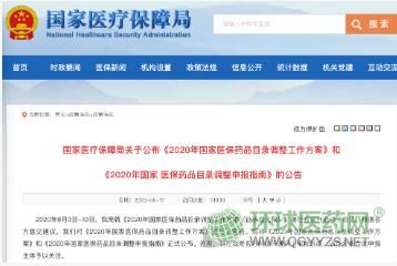 2020年8月3日-10日,國家醫(yī)療保障局就《2020年國家醫(yī)保藥品目錄調(diào)整工作方案(征求意見稿)》向社會(huì)公開征求了意見。8月17日,《2020年國家醫(yī)保藥品目錄調(diào)整工作方案》和《2020年國家醫(yī)保藥品目錄調(diào)整申報(bào)指南》正式公布。