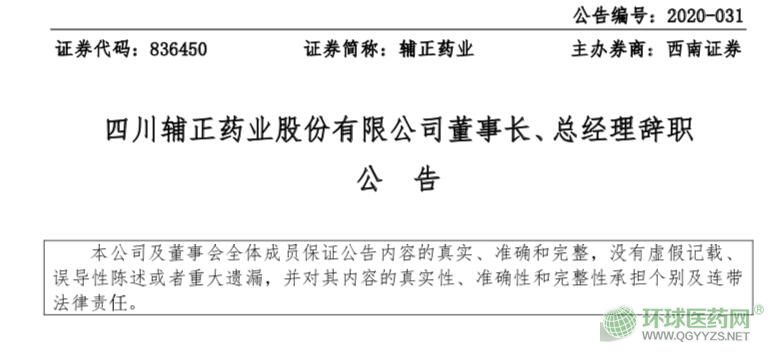 8月17日,四川輔正藥業(yè)發(fā)布董事長、總經(jīng)理辭職的公告稱,8月10日公司董事會收到董事長孫繼林遞交的辭職報告,自2020年8月10日起辭職生效。同日,孫繼林還辭任了四川輔正藥業(yè)的總經(jīng)理職務(wù),辭職同樣于8月10日起生效。辭職后,其不再擔任輔正藥業(yè)其它職務(wù)。