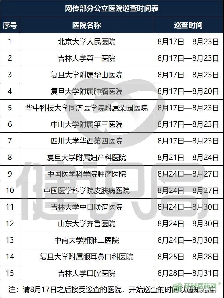 在一份網(wǎng)傳部分公立醫(yī)院巡查時間表發(fā)現(xiàn),北京大學(xué)人民醫(yī)院、吉林大學(xué)第一醫(yī)院、復(fù)旦大學(xué)附屬華山醫(yī)院、中國醫(yī)學(xué)科學(xué)院腫瘤醫(yī)院、山東大學(xué)齊魯醫(yī)院、中南大學(xué)湘雅二醫(yī)院等眾多知名三甲醫(yī)院均在此次巡查之列。