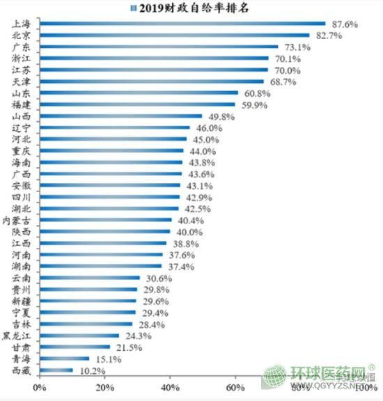 2019年23個省市財政自給率不足50%。2019年各省市財政收入/支出低于50%的有23個,主要集中在西部和東北,僅8個省市財政自給率高于50%。地方政府收支不足主要靠中央對轉(zhuǎn)移支付和稅收返還以及地方政府一般債券。