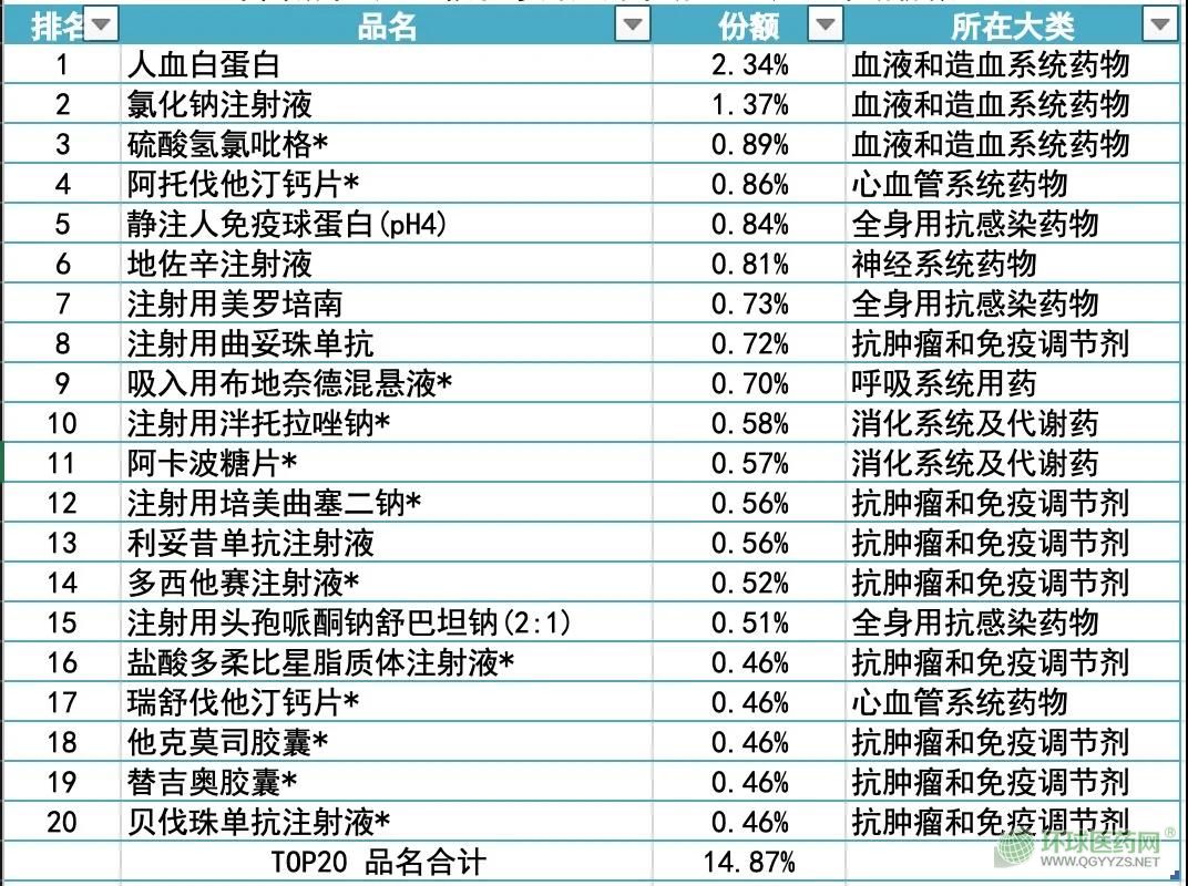 表1 2019年中國城市公立醫(yī)院化學(xué)藥用藥市場Top 20產(chǎn)品市場份額