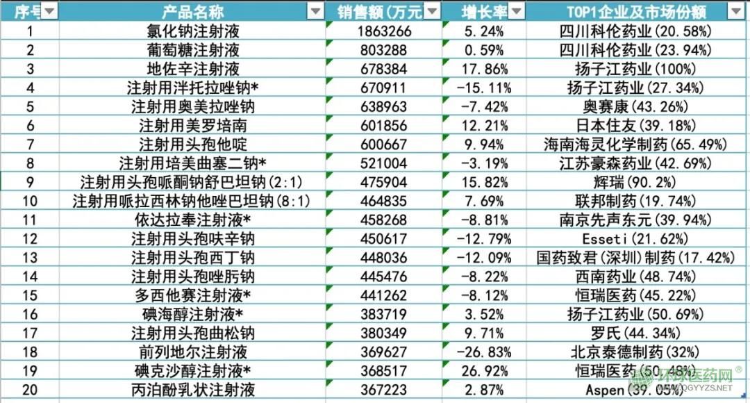 表2 2019年中國公立醫(yī)療機(jī)構(gòu)終端化藥注射劑Top 20產(chǎn)品