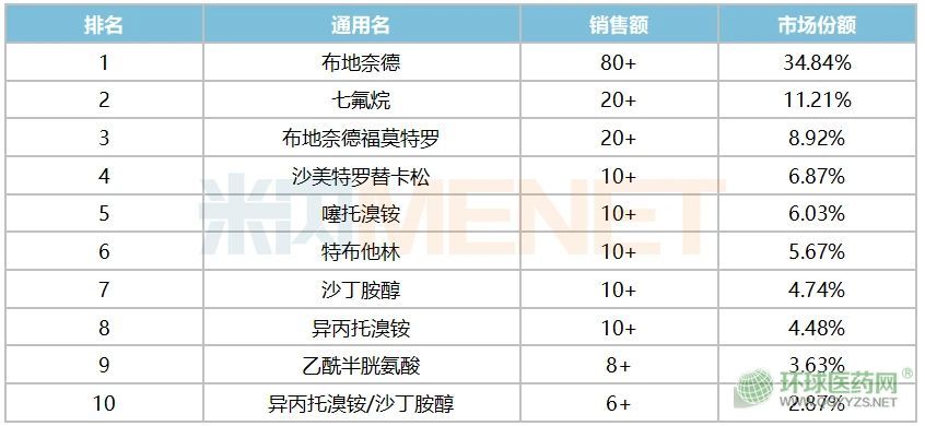 表1:中國(guó)公立醫(yī)療機(jī)構(gòu)終端化學(xué)藥吸入劑TOP10品種(單位:億元)