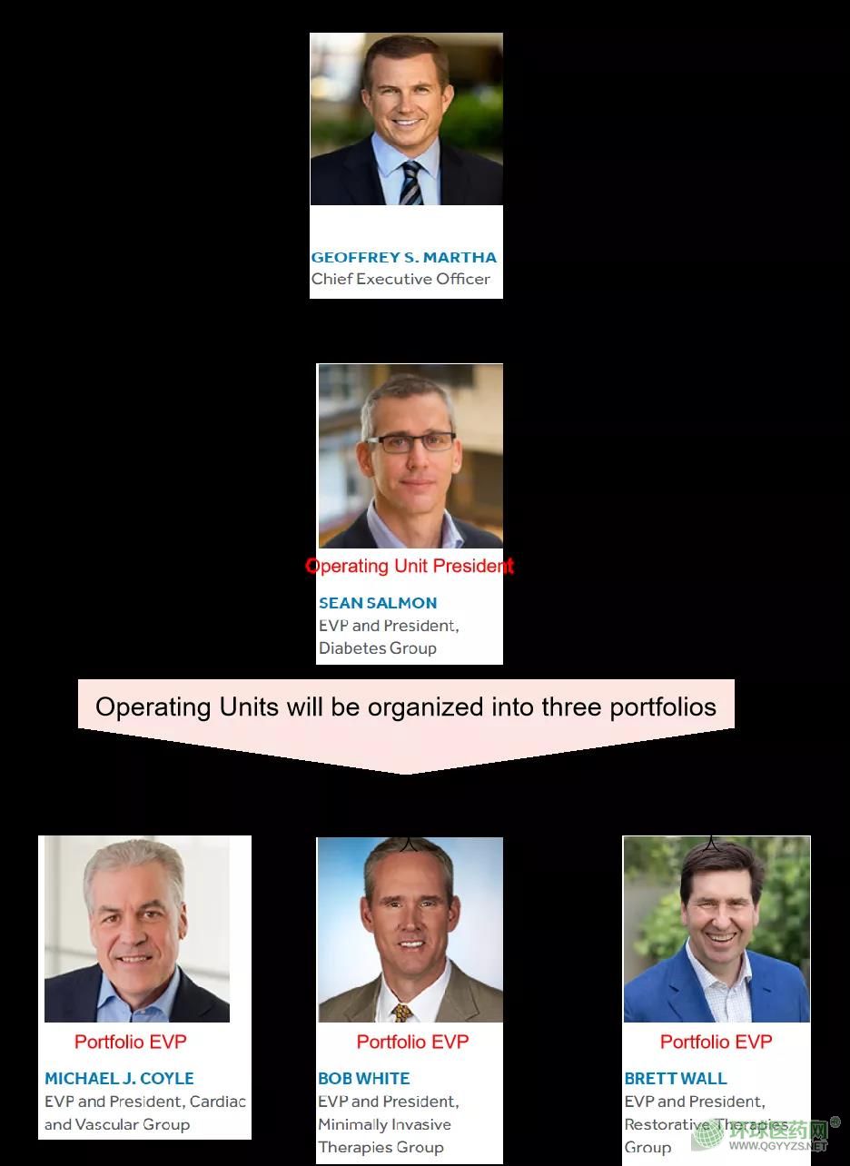 運(yùn)營(yíng)部門“Operating Units”將被分成三個(gè)子部門(Three Portfolios),由Mike Coyle(現(xiàn)心血管全球負(fù)責(zé)人), Brett Wall(現(xiàn)恢復(fù)性療法全球負(fù)責(zé)人), 以及Bob White(現(xiàn)微創(chuàng)外科全球負(fù)責(zé)人)擔(dān)任Portfolio Executive Vice President。