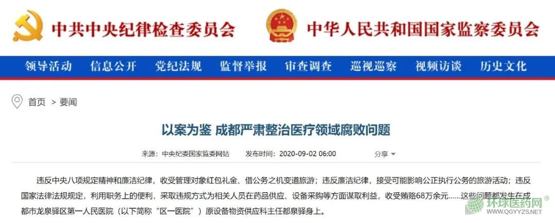 9月2日,中共中央紀(jì)律檢查委員會(huì)官網(wǎng)發(fā)布要聞《以案為鑒 成都嚴(yán)肅整治醫(yī)療領(lǐng)域腐敗問(wèn)題》,案例曝光違反中央八項(xiàng)規(guī)定精神和廉潔紀(jì)律,醫(yī)務(wù)人員收受管理對(duì)象紅包禮金、借公務(wù)之機(jī)變道旅游;違反廉潔紀(jì)律,接受可能影響公正執(zhí)行公務(wù)的旅游活動(dòng);違反國(guó)家法律法規(guī)規(guī)定,利用職務(wù)上的便利,采取違規(guī)方式為相關(guān)人員在藥品供應(yīng)、設(shè)備采購(gòu)等方面謀取利益的違法違紀(jì)行為。