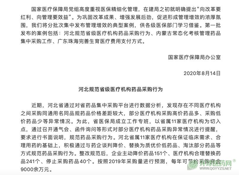 值得注意的是,在8月14日,國家醫(yī)保局在發(fā)布的第一批醫(yī)保管理增效案例中就介紹了河北規(guī)范省級醫(yī)療機構藥品采購行為的探索。