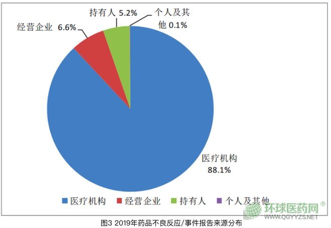 從《國(guó)家藥品不良反應(yīng)監(jiān)測(cè)年度報(bào)告(2019年)》數(shù)據(jù)統(tǒng)計(jì)來看,2019年來自醫(yī)療機(jī)構(gòu)的報(bào)告占88.1%;來自經(jīng)營(yíng)企業(yè)的報(bào)告占6.6%;來自持有人的報(bào)告占5.2%;來自個(gè)人及其他報(bào)告者的報(bào)告占0.1%。