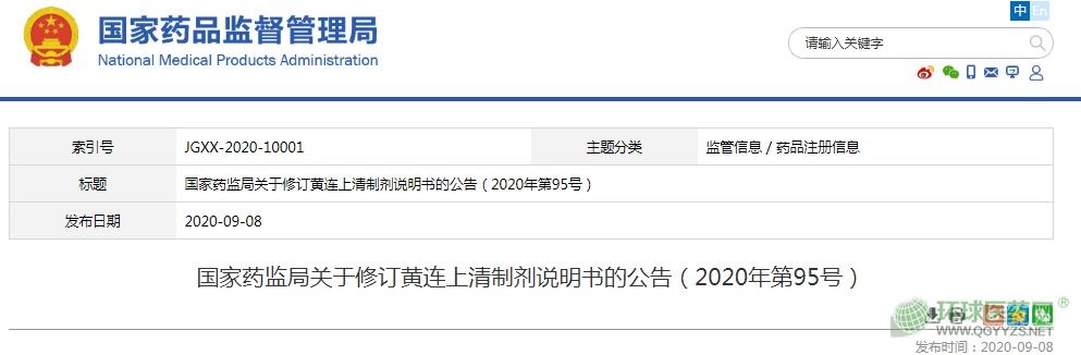 根據(jù)藥品不良反應(yīng)評估結(jié)果,為進(jìn)一步保障公眾用藥安全,國家藥品監(jiān)督管理局決定對黃連上清制劑(包括丸劑、片劑、顆粒劑、膠囊劑)說明書【不良反應(yīng)】【禁忌】和【注意事項(xiàng)】項(xiàng)進(jìn)行統(tǒng)一修訂,F(xiàn)將有關(guān)事項(xiàng)公告如下: