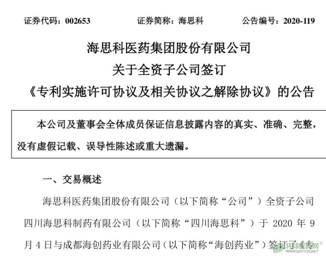 9月7日,海思科醫(yī)藥集團(tuán)股份有限公司發(fā)布公告,全資子公司四川海思科制藥有限公司于 2020 年 9 月 4 日與成都海創(chuàng)藥業(yè)有限公司(以下簡稱“海創(chuàng)藥業(yè)”)簽訂了《專利實(shí)施許可協(xié)議及相關(guān)協(xié)議之解除協(xié)議》(以下簡稱“交易協(xié)議”)。