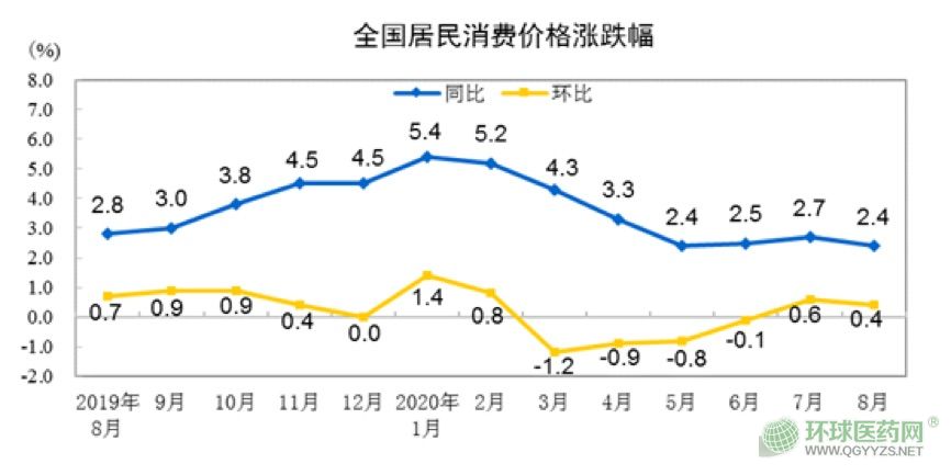 國家統(tǒng)計局9月9日發(fā)布了居民消費指數(shù)月度報告,2020年8月份居民消費價格同比上漲2.4%。其中,醫(yī)療保健價格同比上漲1.5%,環(huán)比上漲0.1%。1-8月,醫(yī)療保健價格比去年同期上漲2.0%。