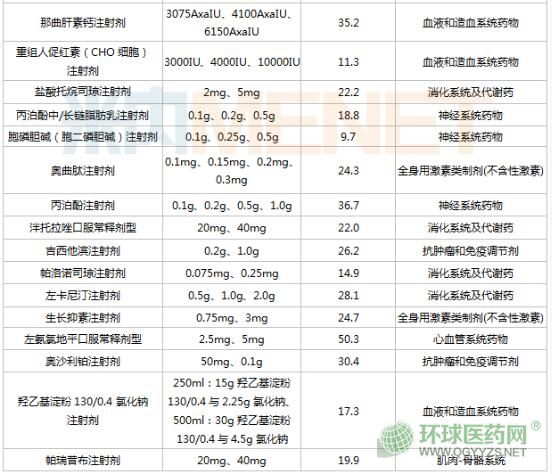 從藥品治療領(lǐng)域看,消化系統(tǒng)及代謝藥涉及的品種達(dá)15個(gè),6個(gè)品種為神經(jīng)系統(tǒng)藥物,4個(gè)品種為血液和造血系統(tǒng)藥物,抗腫瘤和免疫調(diào)節(jié)劑、心血管系統(tǒng)藥物、全身用激素類制劑(不含性激素)、雜類則各有3個(gè)品種。