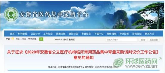 10月9日,安徽省醫(yī)藥集中采購平臺(tái)發(fā)布通知關(guān)征求《2020年安徽省公立醫(yī)療機(jī)構(gòu)臨床常用藥品集中帶量采購談判議價(jià)工作公告》的意見。