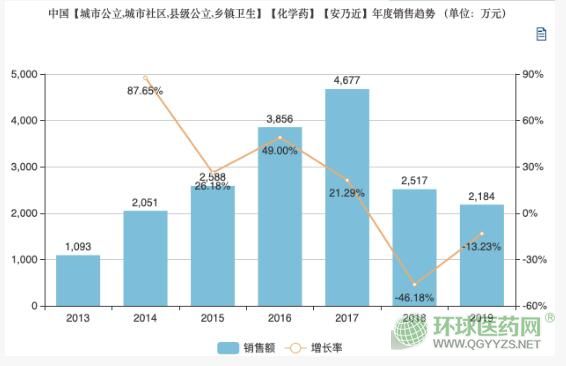 賽柏藍(lán)查詢米內(nèi)網(wǎng)數(shù)據(jù)發(fā)現(xiàn),在我國(guó)醫(yī)院市場(chǎng)中,2013年安乃近的市場(chǎng)規(guī)模只有1093萬(wàn)元,但其市場(chǎng)規(guī)模一直在擴(kuò)大,在2017年達(dá)到了4677萬(wàn)元。直到2018年市場(chǎng)規(guī)模才開(kāi)始下降,2019年其市場(chǎng)規(guī)模仍有2184萬(wàn)元。