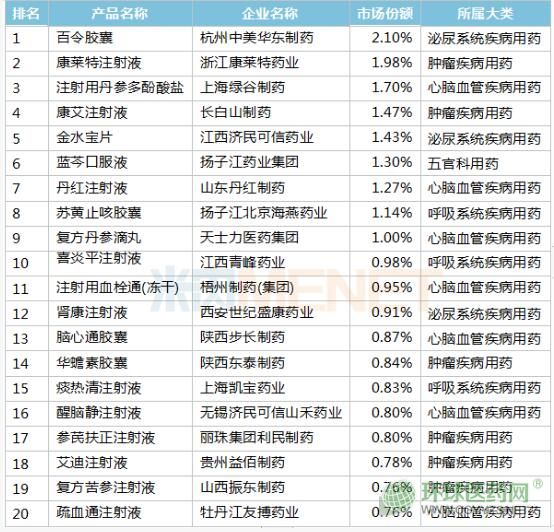 其中,百令膠囊、康萊特注射液、注射用丹參多酚酸鹽、康艾注射液和金水寶片位居銷售前五名;揚(yáng)子江藥業(yè)的藍(lán)岑口服液,山東丹紅制藥的丹紅注射液、揚(yáng)子江北京海燕藥業(yè)的蘇黃止咳膠囊、天士力醫(yī)藥集團(tuán)的復(fù)方丹參滴丸和江西青峰藥業(yè)的喜炎平注射液則分列第5-10名。