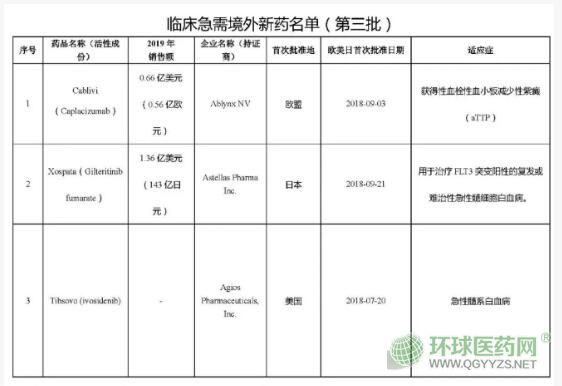 10月29日,CDE公示了第三批臨床急需境外新藥名單,包括丹麥制藥商Ablynx的納米抗體藥物Cablivi、安斯泰來的FLT3抑制劑Xospata、美國(guó)制藥公司Agios的白血病藥物Tibsovo等 7款境內(nèi)未上市且臨床急需的特效藥,治療領(lǐng)域涉及血液系統(tǒng)疾病、惡性血液疾病、遺傳代謝性疾病、神經(jīng)系統(tǒng)、感染性疾病和眼部疾病。