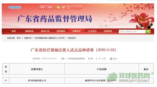 11月2日,廣東省藥監(jiān)局發(fā)布《廣東省醫(yī)療器械注冊(cè)人試點(diǎn)品種清單》,在品種清單中的第61項(xiàng),華為終端有限公司作為申請(qǐng)注冊(cè)人,申請(qǐng)了醫(yī)療器械--腕部單導(dǎo)心電采集器(VID-B99)。
