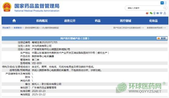 據(jù)賽柏藍(lán)器械在國(guó)家藥監(jiān)局查詢(xún),該產(chǎn)品注冊(cè)編號(hào)為粵械注冊(cè)20202071705,注冊(cè)人為華為終端有限公司,產(chǎn)品管理類(lèi)為第二類(lèi),適用的范圍或預(yù)期用途:供成人腕部單導(dǎo)心電數(shù)據(jù)的采集用。