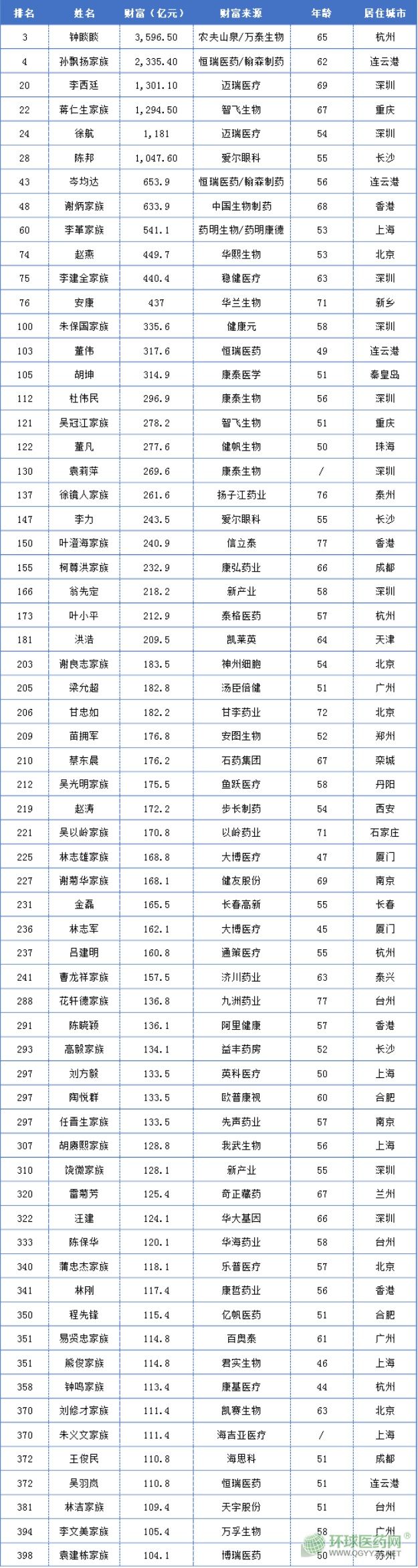 另,值得提及的是22位(財(cái)富主要來源為醫(yī)療健康)新人躋身富豪榜,包括10月27日上市的先聲藥業(yè)任晉生家族。