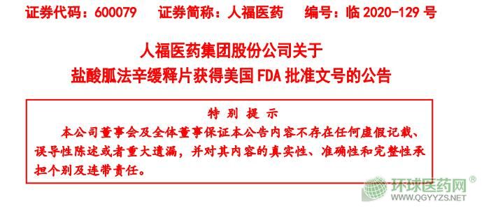 11月26日,人福醫(yī)藥發(fā)布公告稱,近日,其控股子公司宜昌人福藥業(yè)有限責任公司(以下簡稱“宜昌人!,公司持有其80%的股權(quán))收到美國FDA關(guān)于鹽酸胍法辛緩釋片的批準文號,藥品規(guī)格為1mg、2mg、3mg、4mg。