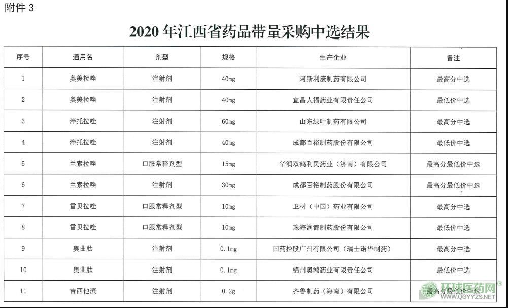 在通知中,江西省公布了2020年江西省藥品帶量采購中選結(jié)果——從中選結(jié)果看,奧美拉唑、泮托拉唑、蘭索拉唑、雷貝拉唑、奧曲肽、吉西他濱等藥品有企業(yè)中選,中選藥企有阿斯利康、宜昌人福藥業(yè)、山東綠葉制藥、成都百裕制藥、華潤雙鶴利民藥業(yè)、衛(wèi)材中國、珠海潤都制藥、國藥控股廣州、錦州奧鴻藥業(yè)、齊魯制藥。