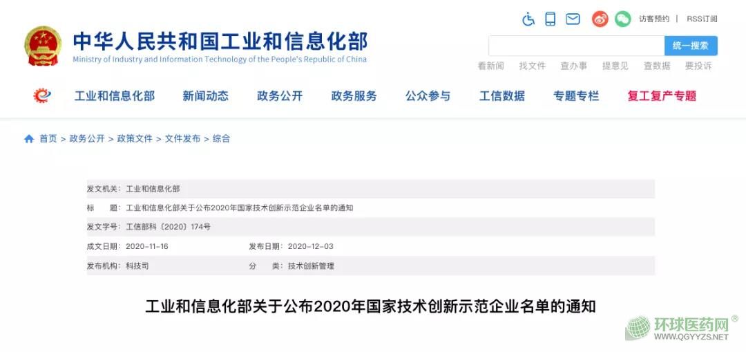 12月3日,中國(guó)工信部發(fā)布的《工業(yè)和信息化部關(guān)于公布2020年國(guó)家技術(shù)創(chuàng)新示范企業(yè)名單的通知》顯示,共63家企業(yè)入選“2020年國(guó)家技術(shù)創(chuàng)新示范企業(yè)名單”,據(jù)梳理其中有6家藥企。