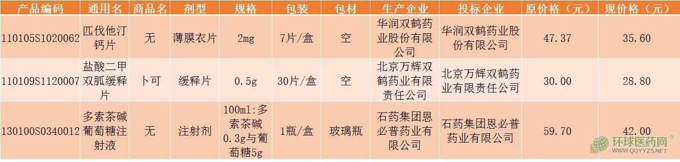 其中,華潤雙鶴藥業(yè)股份有限公司的匹伐他汀鈣片(7片/盒)由47.37下調(diào)至35.6,北京萬輝雙鶴藥業(yè)有限責(zé)任公司的鹽酸二甲雙胍緩釋片(30片/盒)由30元下調(diào)至28.8元,石藥集團恩必普藥業(yè)有限公司的多索茶堿葡萄糖注射液(100ml:多索茶堿0.3g與葡萄糖5g)由59.7元下調(diào)至42元。