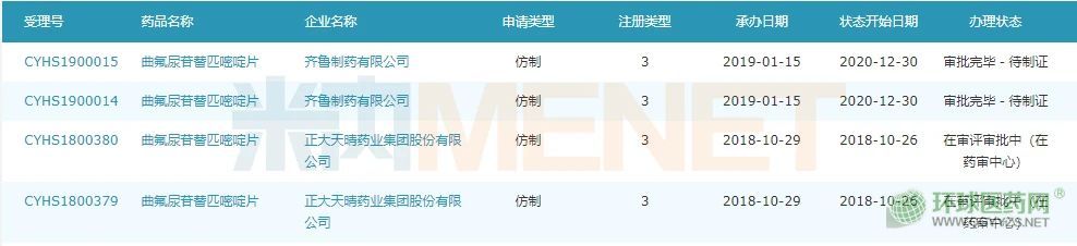 米內網數據顯示,目前申報曲氟尿苷替匹嘧啶片仿制上市的企業(yè)有2家,正大天晴首家申報,但最終被齊魯搶先拿下首仿。