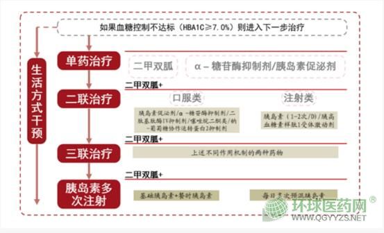 根據(jù)我國《關(guān)于糖尿病的新診斷標(biāo)準(zhǔn)與分型》,對于糖尿病人的診療方式分為4個階段,第一階段是單藥治療,如果血糖控制不達(dá)標(biāo)則進(jìn)入下一步治療,即二甲雙胍+進(jìn)行二聯(lián)治療、三聯(lián)治療甚至胰島素多次注射。其中,二甲雙胍+GLP-1為二聯(lián)治療方案之一。