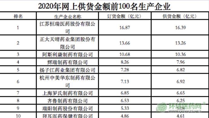 此外,文件還公布了供貨金額前10名的企業(yè)分別是,恒瑞(16.39億元)、正大天晴(13.26億元)、阿斯利康(10.36億元)、輝瑞(7.96億元)、揚(yáng)子江(6.82億元)、中美華東(6.92億元)、羅氏(6.65億元)、齊魯(6.25億元)、瑞陽(yáng)制藥(5.08億元)、拜耳(4.61億元)。