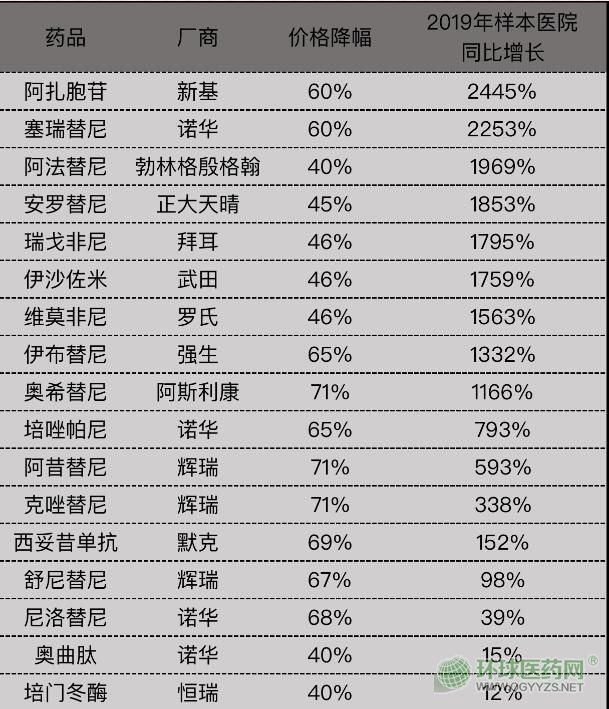 跨國藥企最先吃到了醫(yī)保的紅利。2019年樣本醫(yī)院數(shù)據(jù)顯示,在2018年國家醫(yī)保談判成功的17個藥品當(dāng)中,13個品種在2019年落地以后實現(xiàn)了翻倍的增長。其中,新基的阿扎胞苷和諾華的塞瑞替尼均以60%的降幅進入醫(yī)保,分別取得了約24倍和23倍的同比增速。BI的阿法替尼、拜耳的瑞戈非尼、武田的伊沙佐米、羅氏的維莫非尼降幅約在45%,同比增幅在15倍~19倍。降價幅度(71%)最大的三個產(chǎn)品奧希替尼(AZ)、阿西替尼(輝瑞)、克唑替尼(輝瑞),也分別實現(xiàn)了11倍、6倍和3倍的增速。值得關(guān)注的是,AZ的奧希替尼受益醫(yī)保已成為全國百床大院的TOP10品種。