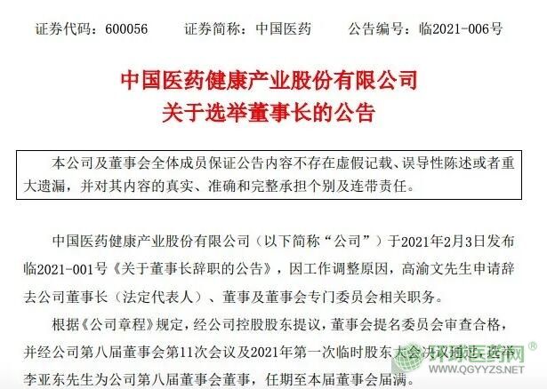 2月23日,中國(guó)醫(yī)藥公告顯示,經(jīng)公司董事會(huì)會(huì)議決議,李亞?wèn)|先生擔(dān)任中國(guó)醫(yī)藥新任董事長(zhǎng)。