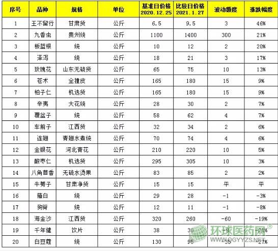 據(jù)四大藥市中亳州藥市發(fā)布的一月份行情漲跌表可以看到,近日,王不留行的價(jià)格漲動(dòng)幅度最大,疫情明星板藍(lán)根、連翹、金銀花價(jià)格上漲漲,近期備受關(guān)注度調(diào)料類藥物八角茴香價(jià)格較穩(wěn)定,但同類藥物白豆蔻價(jià)格波動(dòng)較大。