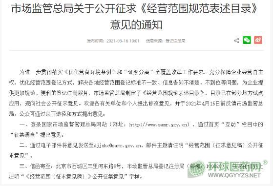 3月16日,國家市場總局發(fā)布了公開征求《經(jīng)營范圍規(guī)范表述目錄》(以下簡稱《目錄》)意見的通知。