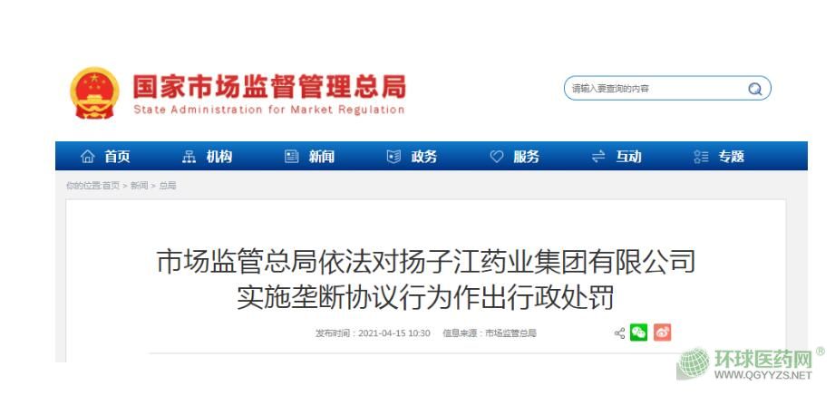 2021年4月15日,市場監(jiān)管總局根據(jù)《反壟斷法》第四十六條、四十九條規(guī)定作出行政處罰決定,責(zé)令揚(yáng)子江藥業(yè)集團(tuán)停止違法行為,并處以其2018年銷售額254.67億元3%的罰款,計(jì)7.64億元。