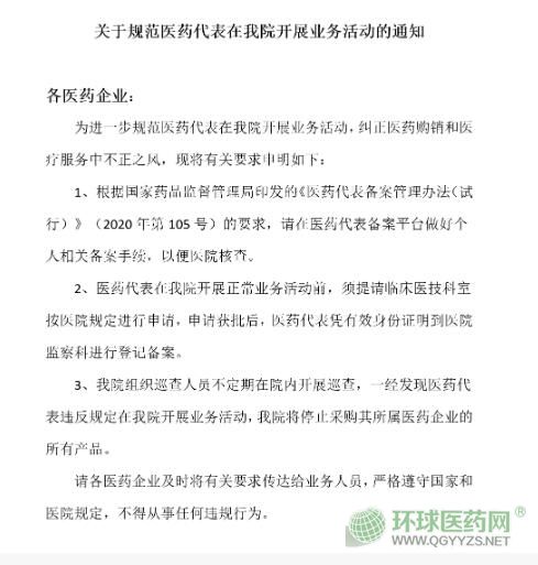 據(jù)悉,這則提醒并不是針對(duì)一家醫(yī)院,而是“中山系”的所有醫(yī)院。目前,已有醫(yī)院下發(fā)以下通知,明確要求藥企要做好醫(yī)藥代表備案管理,且醫(yī)院將不定期開展巡查,一旦發(fā)現(xiàn)醫(yī)藥代表有違規(guī)行為,將停止采購(gòu)相關(guān)企業(yè)所有產(chǎn)品。